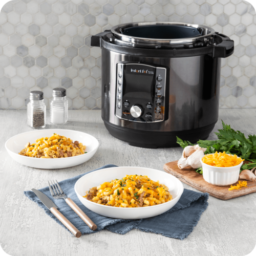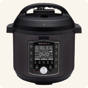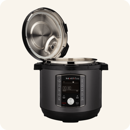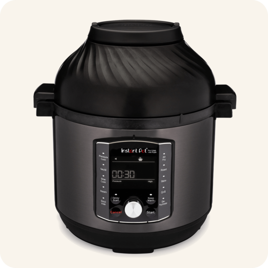 Pro Crisp™ Multicooker + Air Fryer combină gătitul sub presiune și prăjirea cu aer cald într-un singur aparat, datorită celor două capace detașabile. Gătește puiul în modul presiune, apoi schimbă capacul pentru a obține o crustă aurie și crocantă. Poți folosi direct funcția de prăjire cu aer pentru gustări congelate, prăjituri și multe altele.