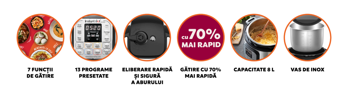 Instant Pot® Duo™ funcționează ca o oală sub presiune, tigaie, aburitor, slow cooker, aparat de gătit orez, încălzitor de mâncare și aparat de iaurt. Economisești spațiu pe blat și elimini dezordinea din bucătărie. Orice rețetă, de la supe și tocănițe până la deserturi, este gata rapid și perfect gătită. Capacitatea de 8 litri este potrivită pentru familie, fiind perfectă pentru până la 8 porții – ideală pentru familii numeroase, întâlniri cu prietenii, pregătirea meselor în avans și gătitul în cantități mai mari. Cu Instant Pot® Duo™, gătitul devine mai simplu, mai rapid și mai eficient, oferindu-ți rezultate consistente de fiecare dată. Este soluția ideală pentru cei care doresc mese gustoase, gătite sănătos, fără efort.